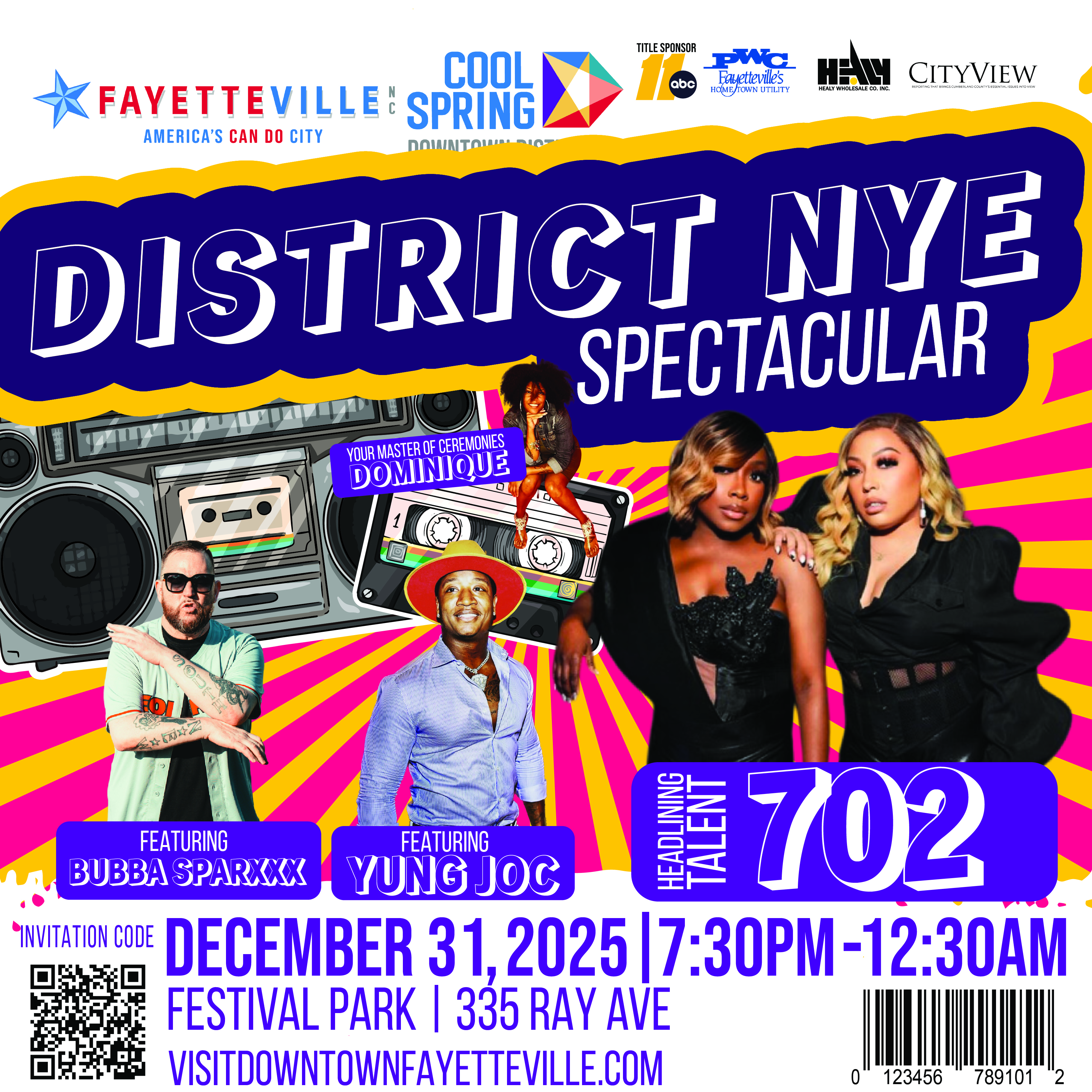 The City of Fayetteville and Cool Spring Downtown District are pleased to announce the return of A District New Year’s Eve Spectacular for its fifth year, held in Festival Park (335 Ray Ave) on Wednesday, December 31 from 7:30PM-12:30AM.